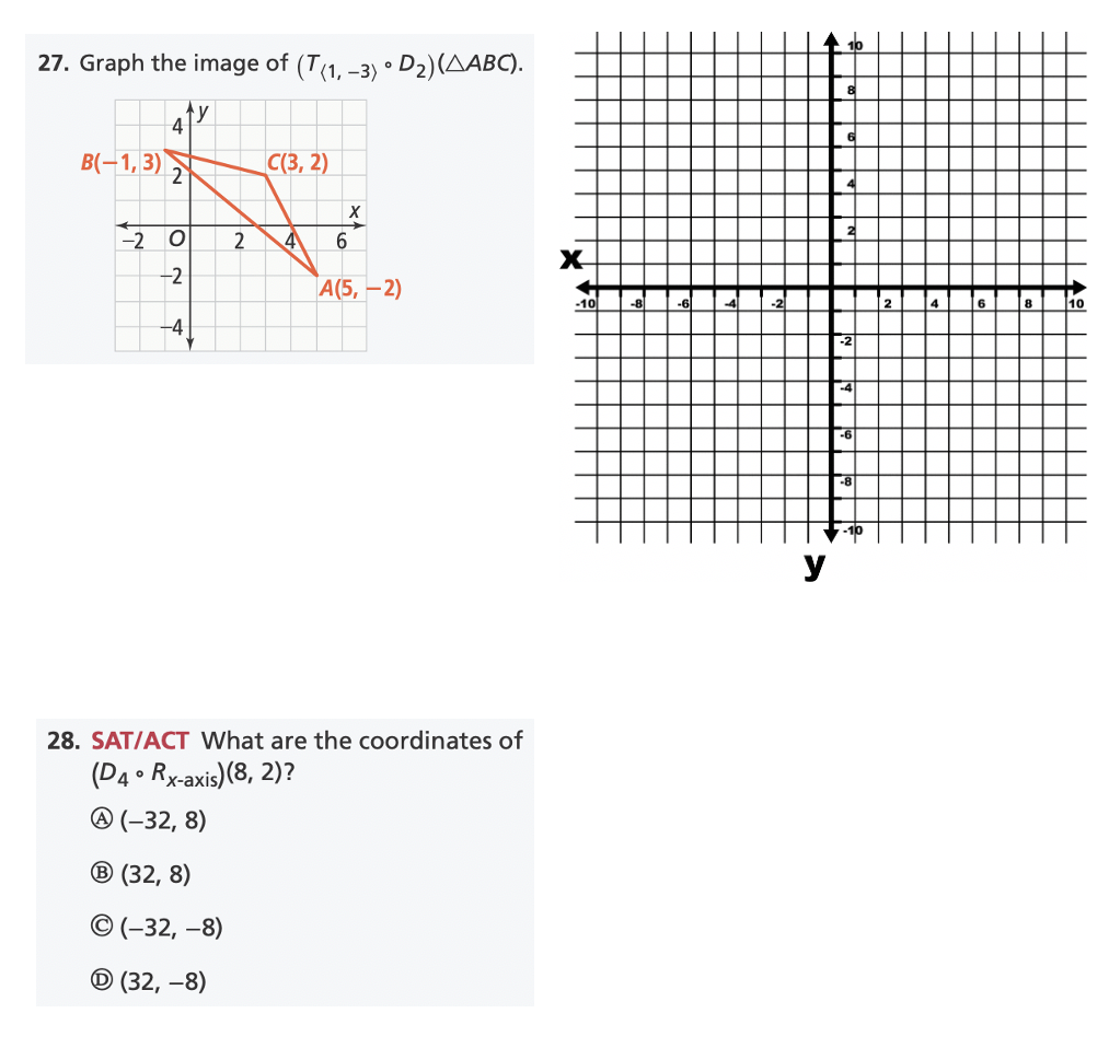 What are the coordinates of (D4 ∘R x-axis)(8, 2)? I strongly recommend taking the preimage point and writing out the transformation in two parts to get the final values for the image coordinates.