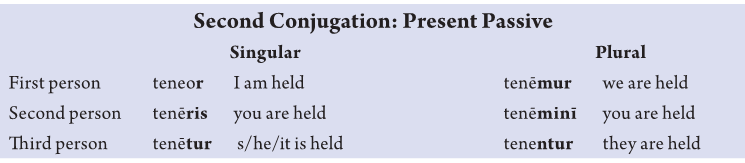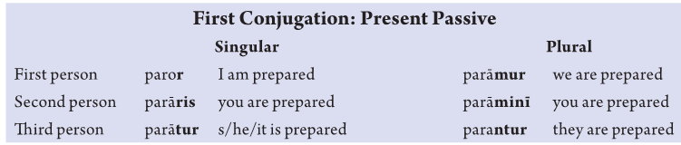 Where is the stem vowel of the first conjugation absent in the present passive?