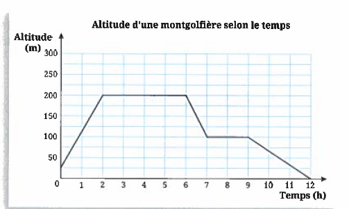 La fonction est ______________ de [2,6]U[7,9]. Pendant ces moments, la montgolfière garde ____________ altitude. Cependant, la fonction est _________________ entre[6,7]U[9,12]. L'_________________________ est 25 et l'_________________________ est 12.