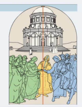 - Personaggi disposti secondo una doppia circonferenza, che riprende la forma del tempio e del coronamento della tavola