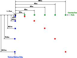 Figure below shows two balls released simultaneously from a mechanism that allows one ball to drop freely while the other is projected horizontally. Explain why the balls fall farther and farther each successive time interval. Explain why the projected ball has the same vertical location as the falling ball.