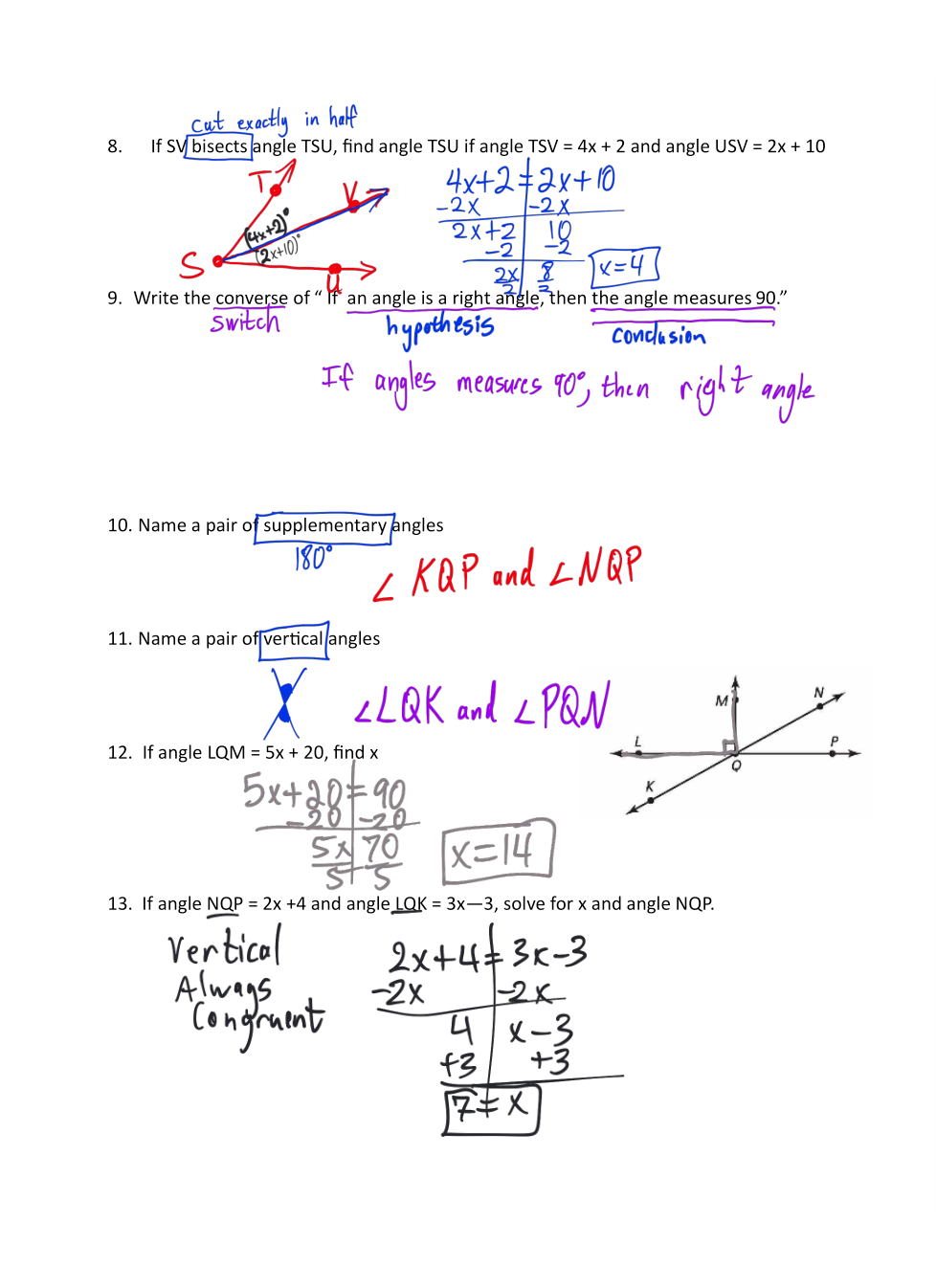 If the measure of angle VSR is 8x +18, find the value of x so that line US is perpendicular to line VS. In other words in means that the angle needs to be 90°.