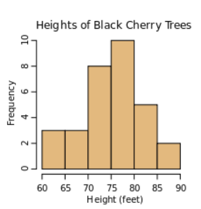 The following data was collected as a scientist walked through a forest. Write down two true statements about the variation and distribution in height amongst the cherry trees in this forest based on the histogram below.