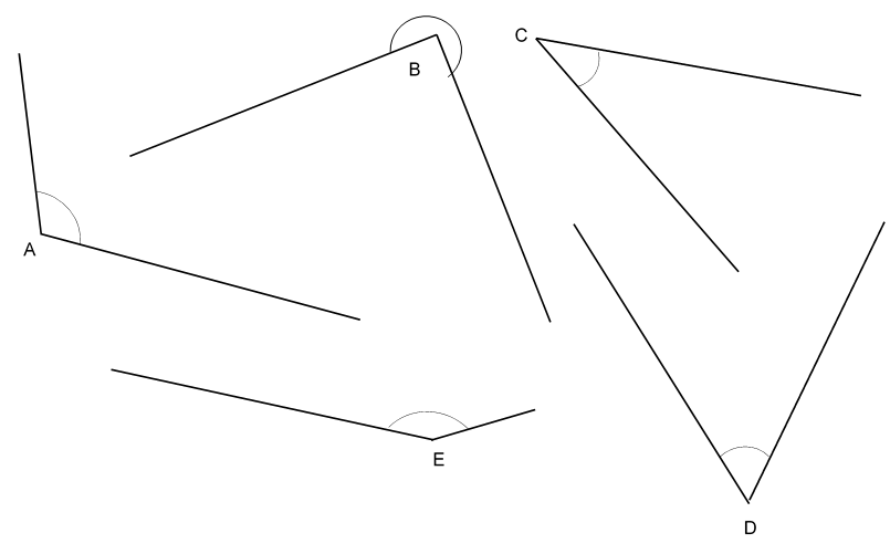 [Open vraag] Schat de hoeken met de boogjes. Bij deze opgave moet je wel letten op de juiste NOTATIE.Bij schatten mag jij er best 10 graden naast zitten.(de gescoorde punten vul ik later in)