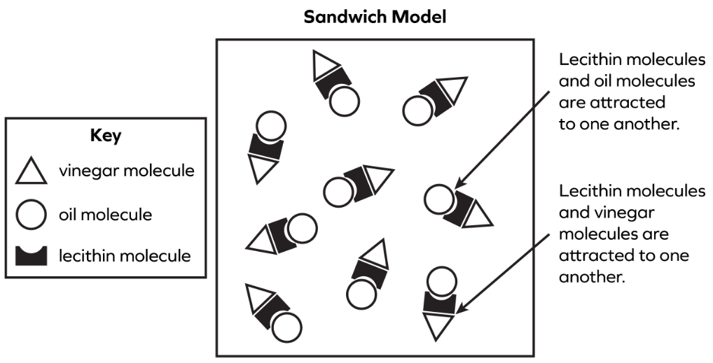 Does this model show vinegar molecules and oil molecules attracted (combined, connected) to each other?