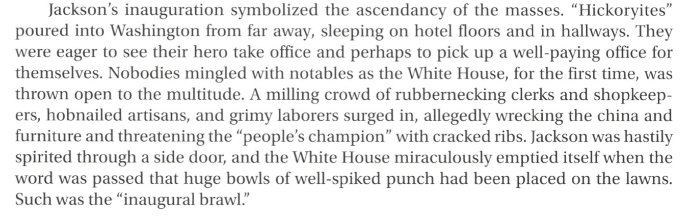 The passage suggests that Andrew Jackson's inauguration symbolized the