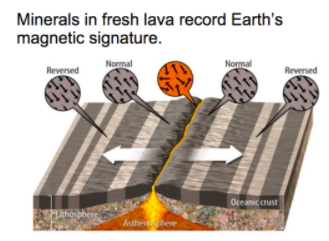 A. At the center of the ridge, hot magma pushes up through the crust and hardens into rock. Once the magma hardens, the alignment of magnetic domains in the rock is frozen in place forever. Magnetic domains are regions in the rocks where all the atoms are lined up and pointing toward Earth’s north magnetic pole.