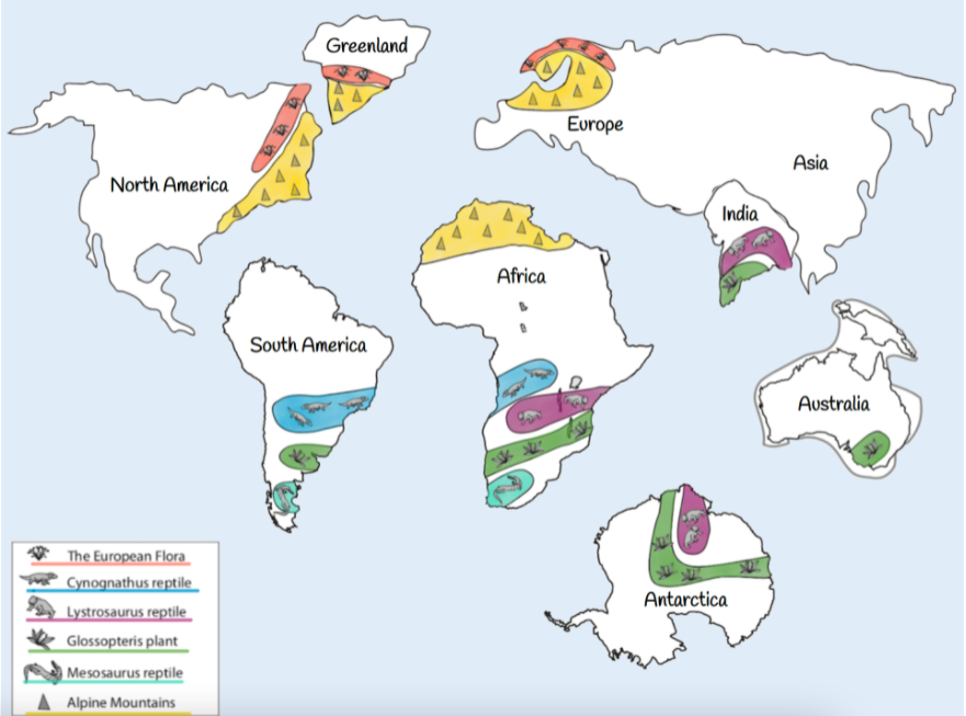 If you were given the following diagram of our continents and fossil information (below the image), and then asked to explain it, what would you say? How would you rearrange the continents?