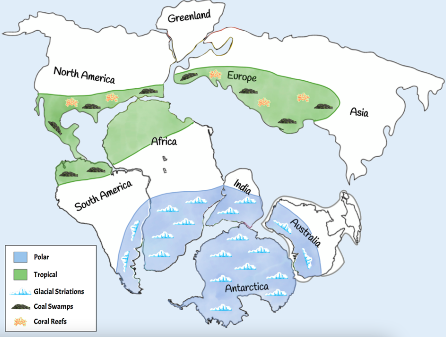 Large sections of South America, Africa, India, Australia, and Antarctica all have similar glacial striation patterns left in the rock. In order for this to happen, the contents we have today must have once been joined together close to the poles (as opposed to near the equator where some of them are now). Similarly, sections of North America, South America, Africa, Europe, and Asia show evidence that they were once tropical environments (i.e., near the equator). A strong piece of evidence for this is the discovery of coal swamps, which form in warm, tropical areas that are teaming with plant life. Additional discoveries of coral reefs and salt deposits suggest the same.