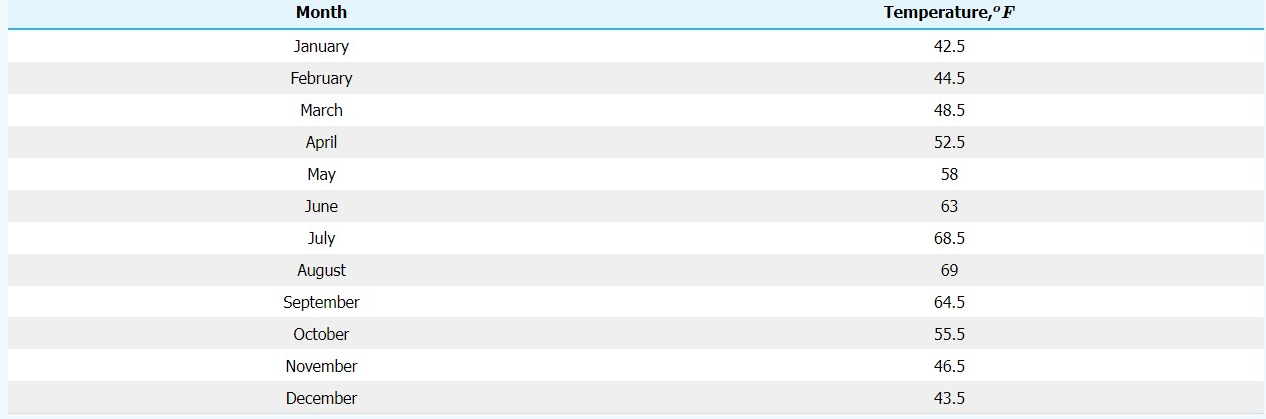 The average monthly temperatures for a small town in Oregon are given in the below Table. Find a sinusoidal function of the form y=Asin(Bx)+C that fits the data (round to the nearest tenth) _______