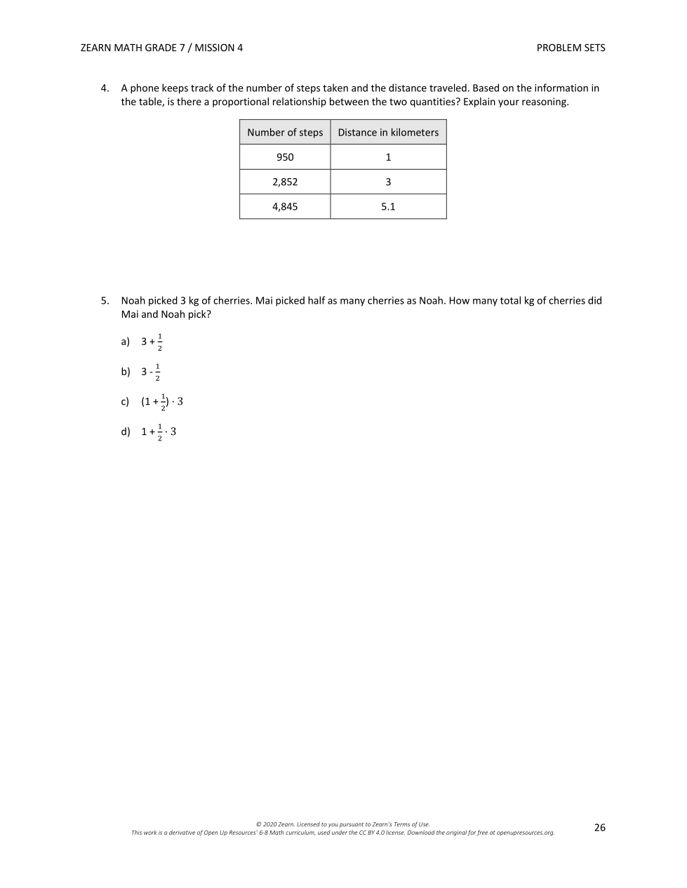 4. A phone keeps track of the number of steps taken and the distance traveled. Based on the information in the table, is there a proportional relationship between the two quantities?