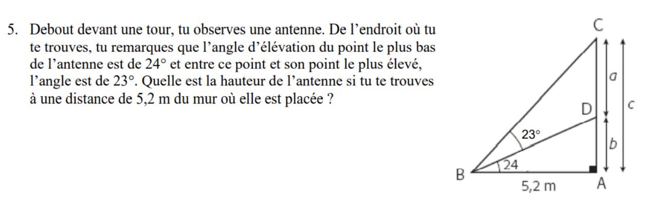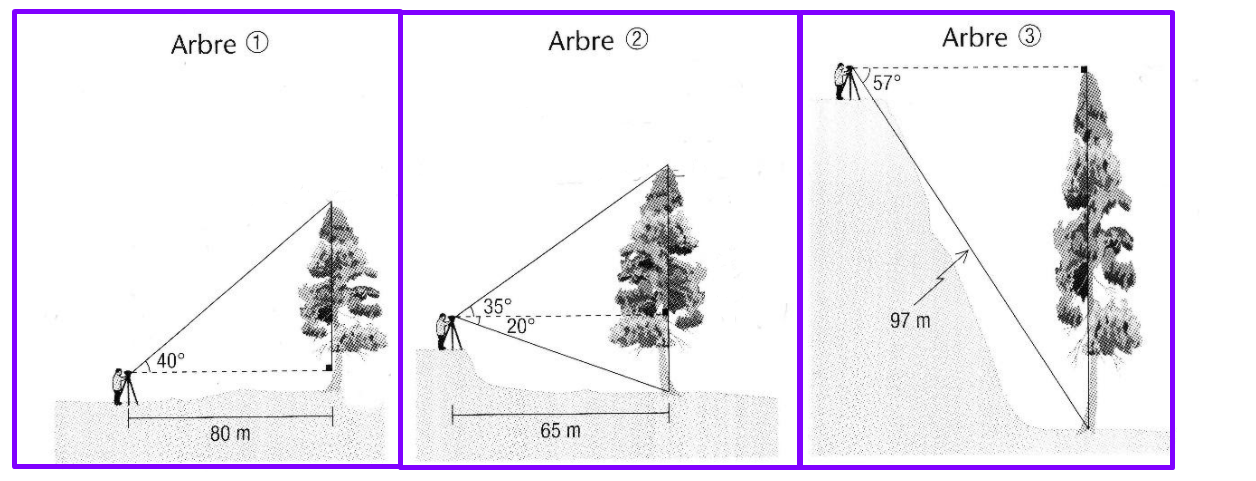En tenant compte du fait que la hauteur de l’instrument utilisé pour déterminer la mesure de l’angle entre l’horizontale et une des extrémités de l’arbre est de 1,5 m, déterminez la hauteur de chacun des arbres.