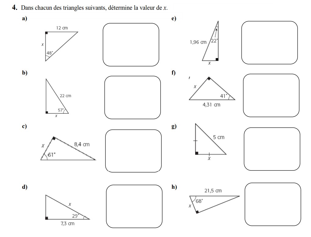 2) Détermine le rapport trigonométrique qui permettrait de calculer la mesure inconnue des 6 triangles suivants.