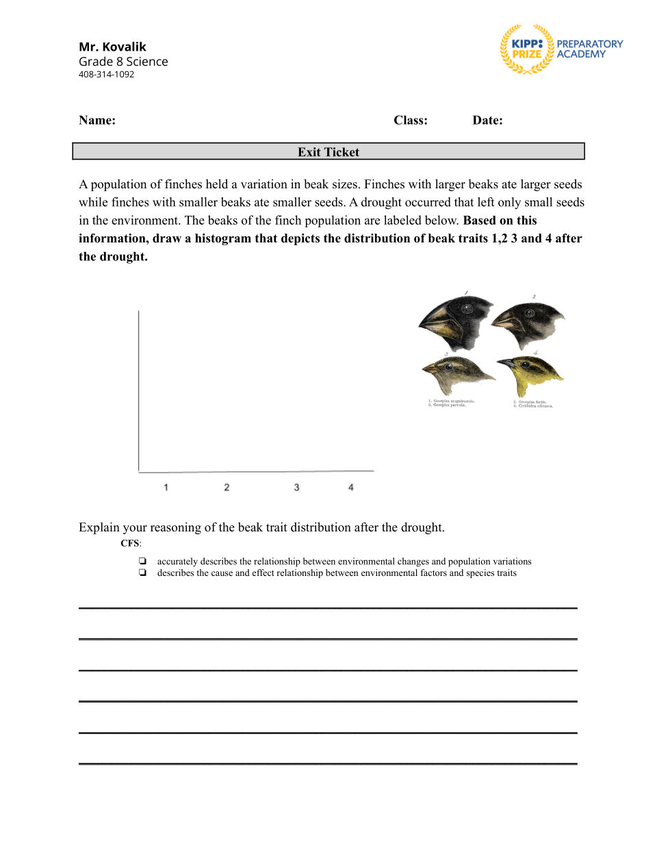 A population of finches held a variation in beak sizes. Finches with larger beaks ate larger seeds while finches with smaller beaks ate smaller seeds. A drought occurred that left only small seeds in the environment. The beaks of the finch population are labeled below. Based on this information, draw a histogram that depicts the distribution of beak traits 1,2 3 and 4 after the drought.