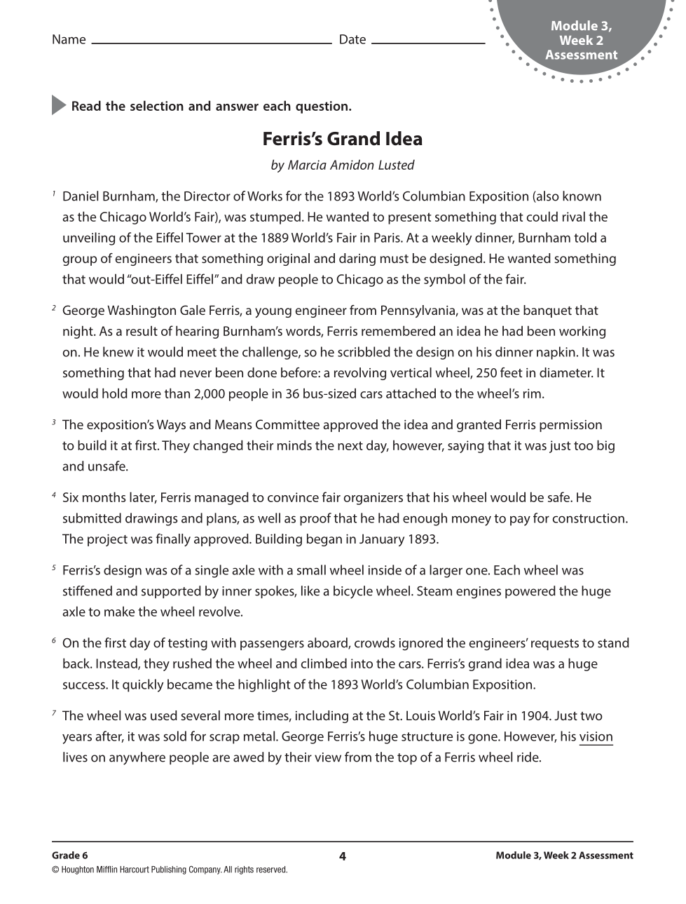 George Ferris submits an idea for a large spinning wheel. | George Ferris provides detailed plans for his wheel's design. | Daniel Burnham wants to present something impressive at the 1893 World's Fair in Chicago. | |
