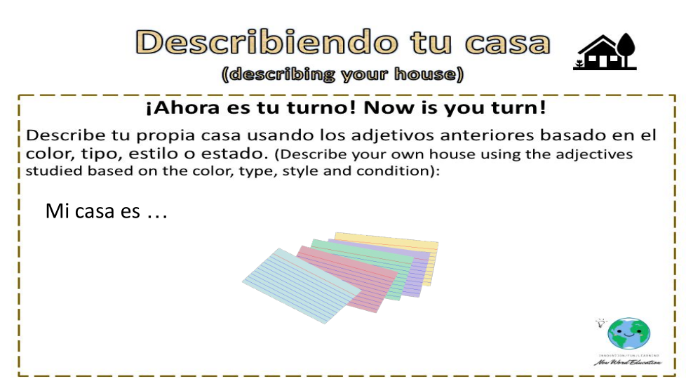 Dibuja (draw) tu casaAfter drawing, describe your casa using the adjectives studied based on the color, type, style and condition (Image #3).