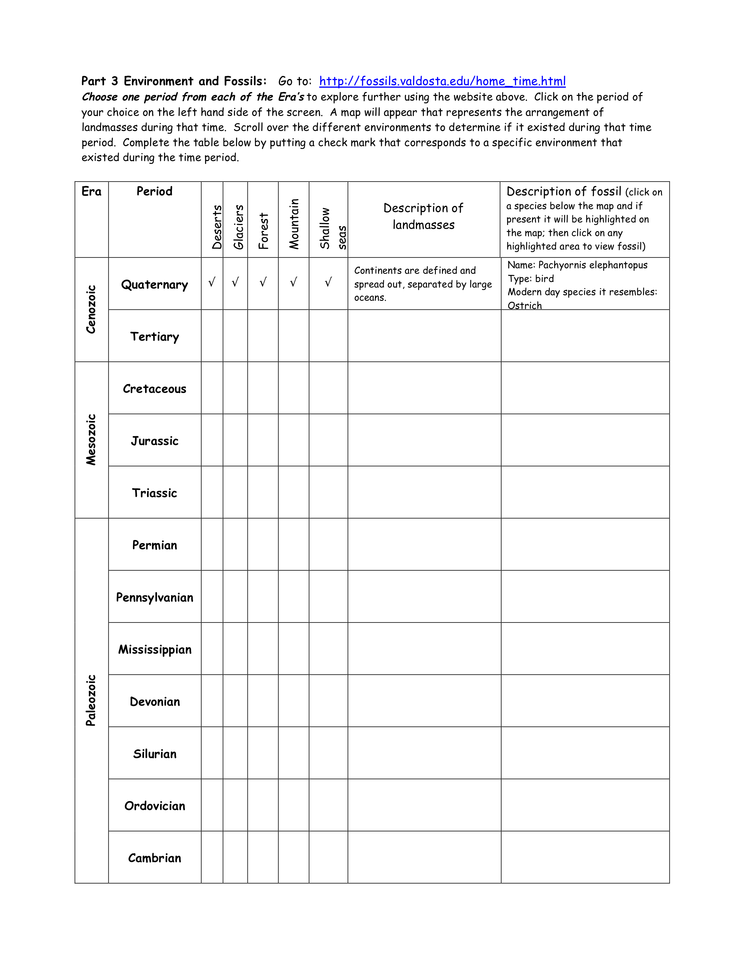List the period you choose from the Paleozoic era. List the type of environments that existed, describe how the continents (landmasses) appeared, and describe the fossil you choose.