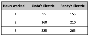 The table below represents two electrical companies for hours of service. At what point will the companies charge the same amount?