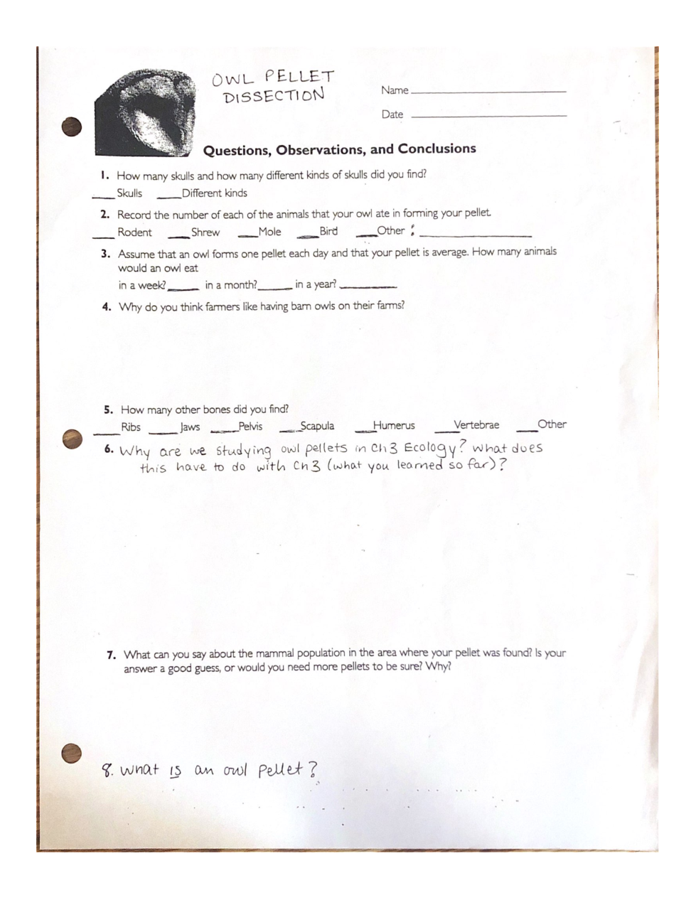 1. How many SKULLS did you find in your owl pellet? And what kind of animal did they come from?