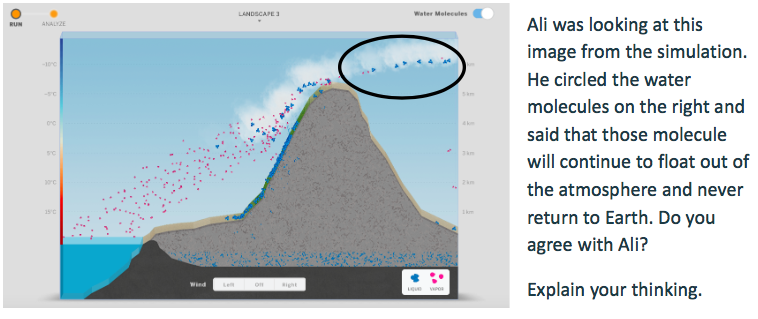 Ali was looking at this image from the simulation. He circled the water molecules on the right and said that those molecules will continue to float out of the atmosphere and never return to earth. Do you agree with Ali?