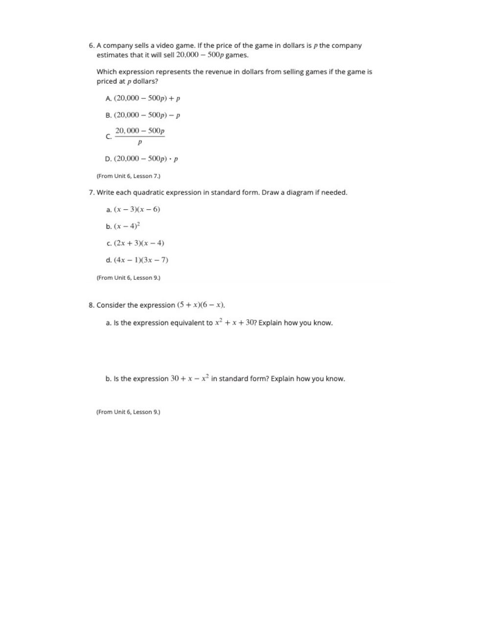 Which expression represents the revenue in dollars from selling games if the game is priced at p dollars?
