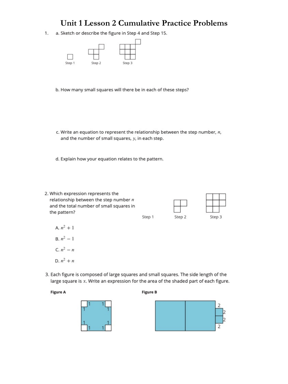 Write an equation to represtent the relationship between the step number, n, and the number of small squares, y, in each step.