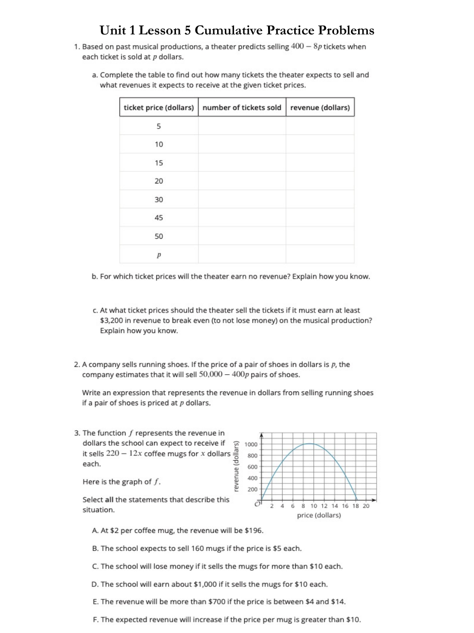 Which ticket cost will earn the theater at least $3200 in revenue? (Select all that apply).