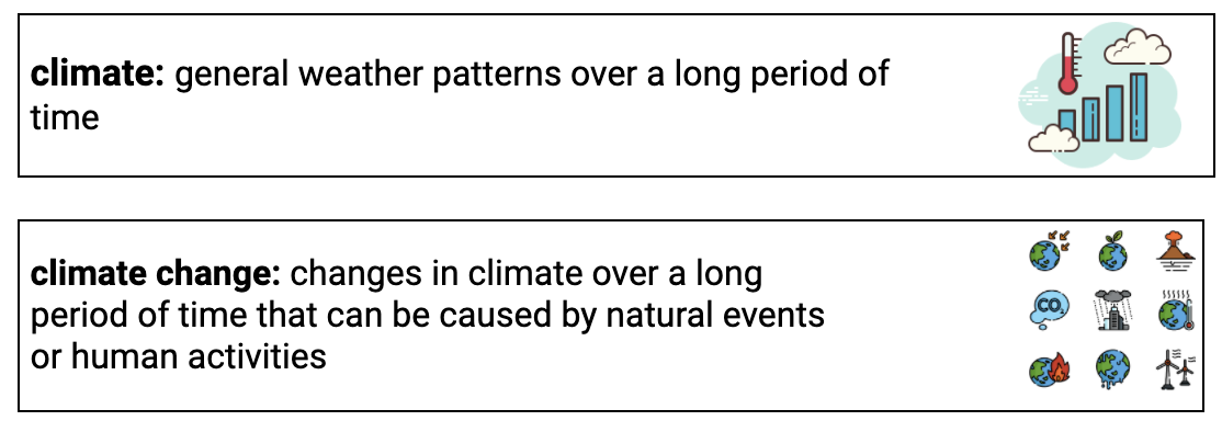 Climate is the weather patterns of an area (temperature, rain, sun, wind) collected over a very long period of time. Studying climate allows us to predict the conditions of a location during a certain time of year. Climate change refers to ways the overall climate on Earth changes over long periods of time!