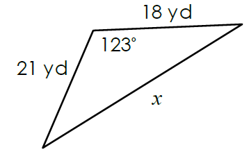 Two trucks, 36 feet apart, are towing a large field mower. If the lengths of the tow ropes are 27 feet and 19 feet, find the angle formed by the two tow ropes.