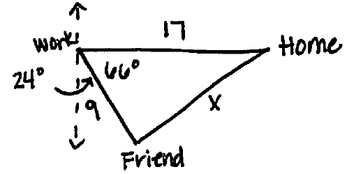 Michael leaves home and drives 17 miles west to work. After work, he travels 9 miles to a friend’s house. If the bearing from work to the friend’s house is S 24° E, find the distance between the friend’s house and home.