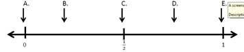 Which letter below best represents the probability of rolling a number greater than 1 on a six-sided die?