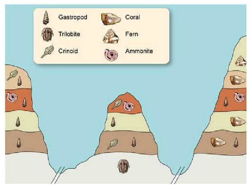 Prompt: An index fossil is a fossil that only shows up in one rock layer (a single rock layer has the same color). Study the three hills and identify the three index fossils.