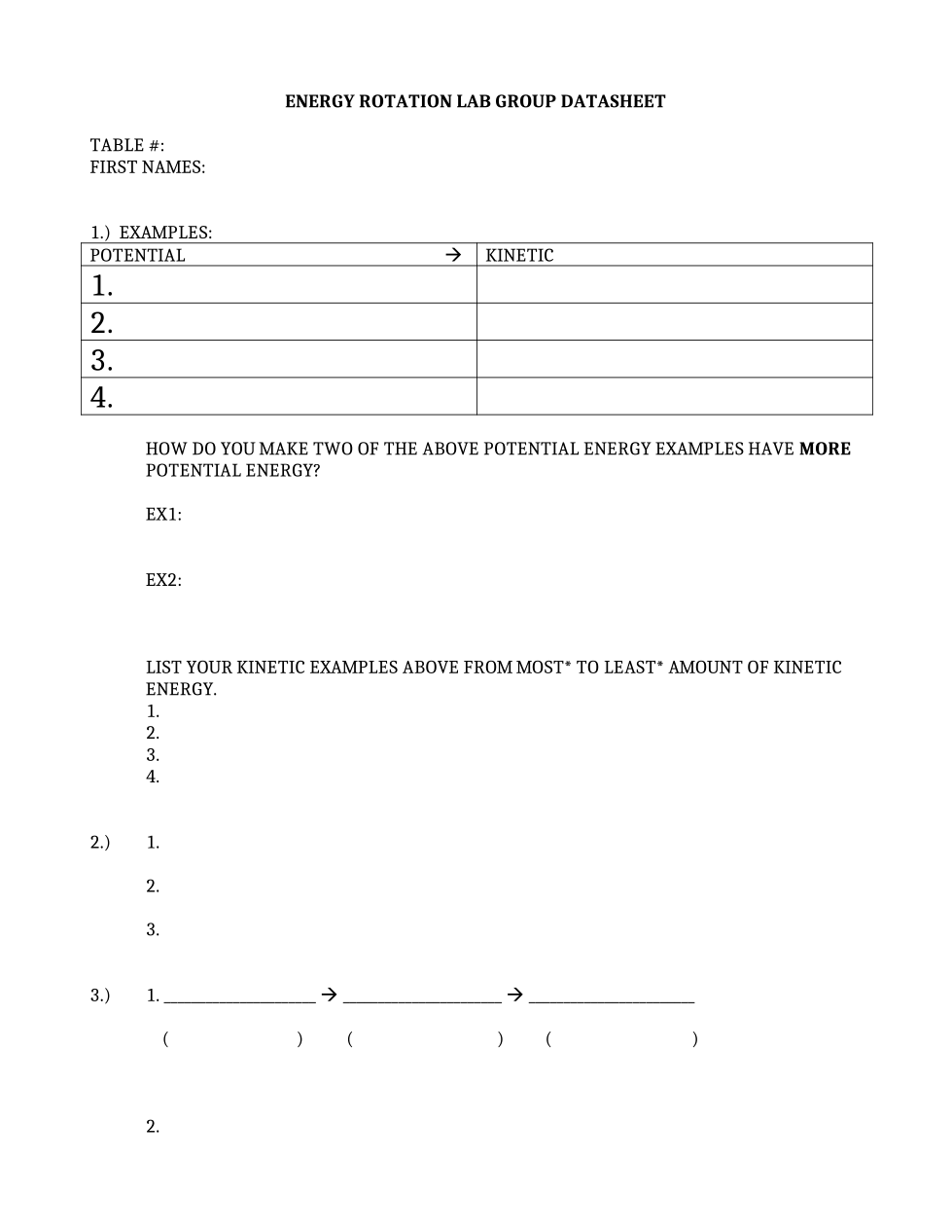 Look around the room. Provide an example of something with POTENTIAL energy and then describe it transformed to KINETIC energy.