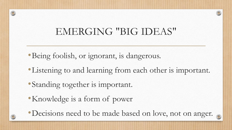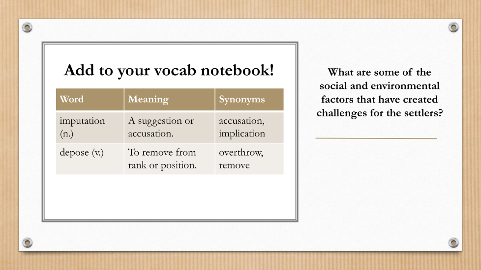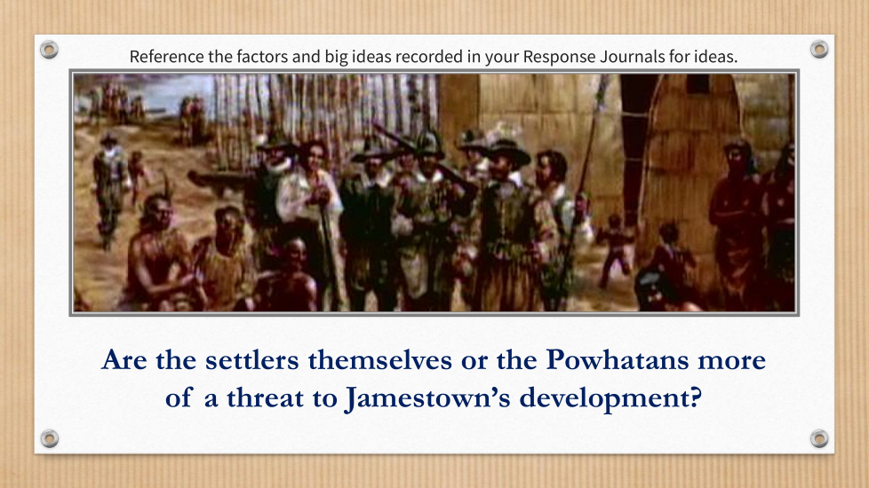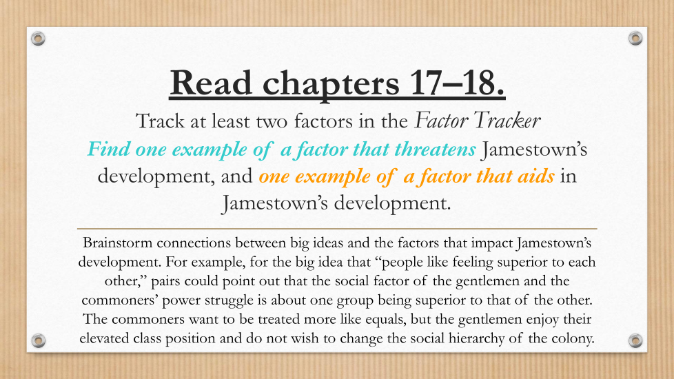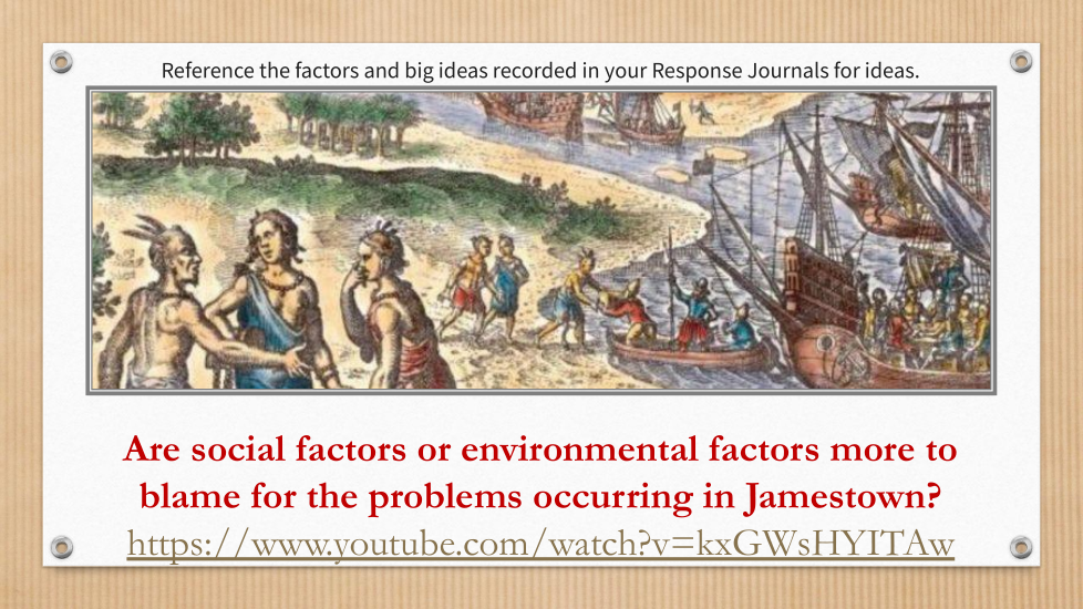 Students record these big ideas in their literacy notebooks. Explain to students that in this lesson, students will continue to work from lesson 5 of examining the novel's big ideas. Students will also examine how social and environmental factors shaping Jamestown's development help highlight some of the big ideas that have emerged in the novel.
