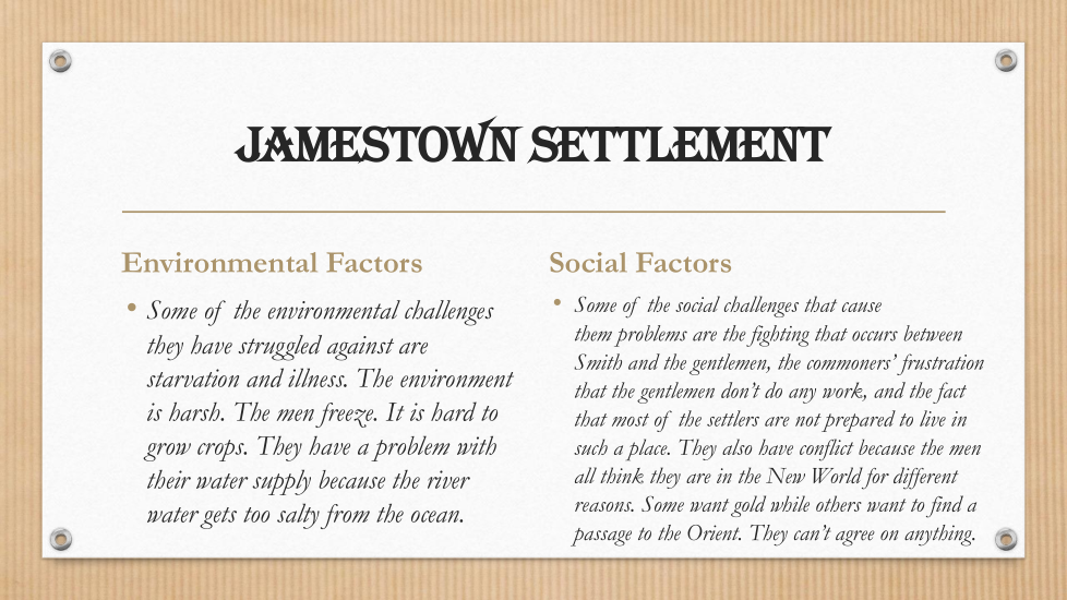 TSW understand the social and environmental factors that have affected the development of Jamestown, and how these factors contribute to the novel’s big ideas.