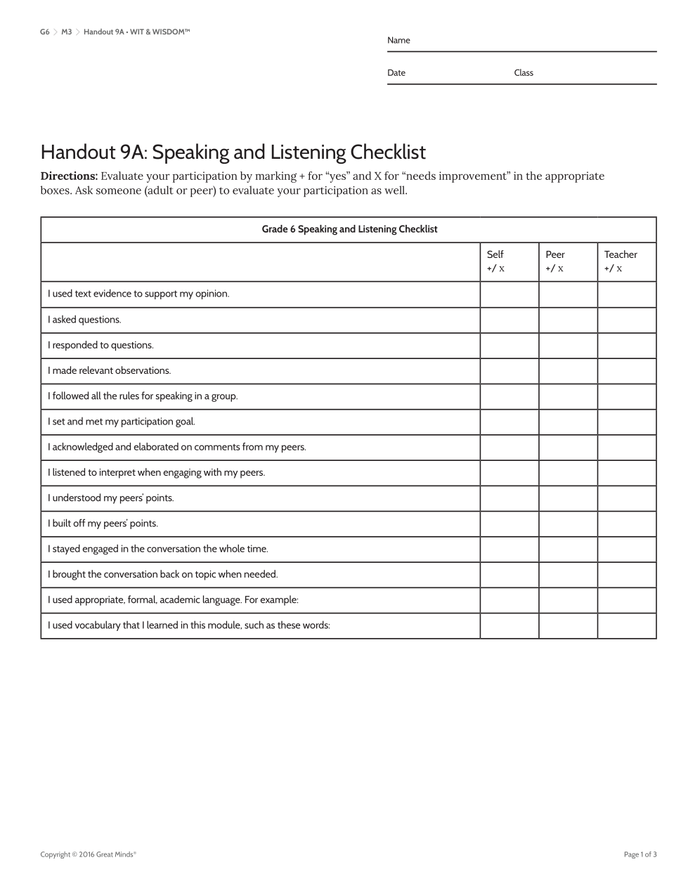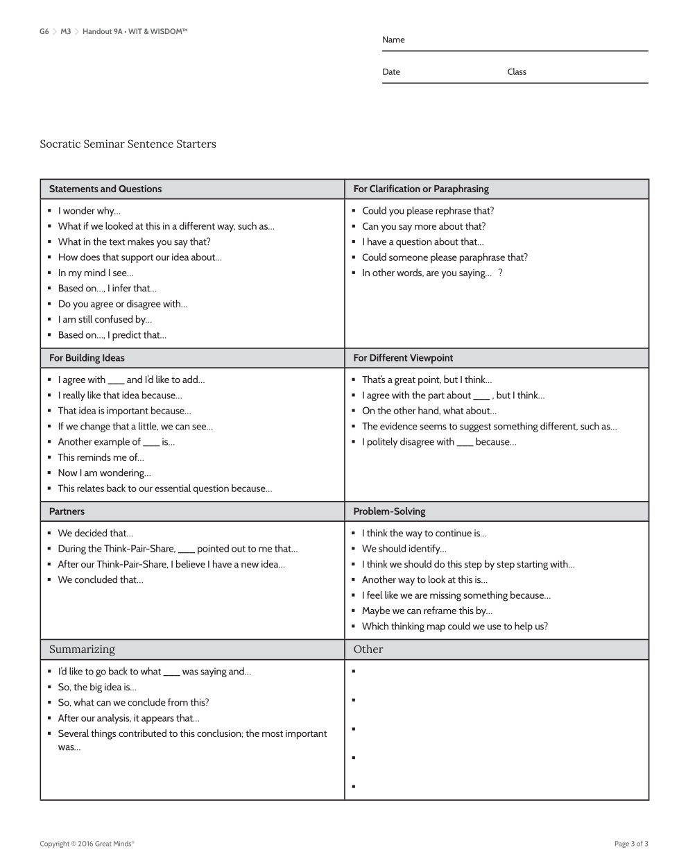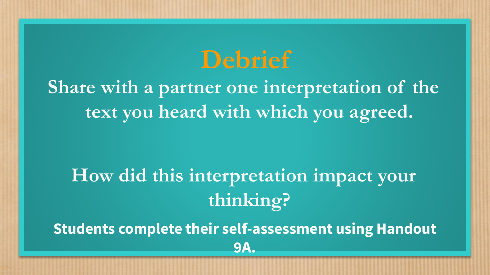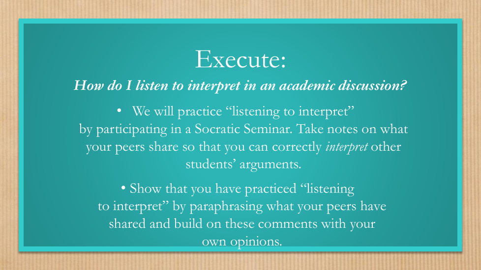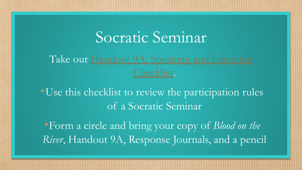 Students participate in the module's first Socratic Seminar. They execute their listening to intrepret skills examined and practiced in earlier lessons as they discuss the big ideas advanced in the story. To prepare them for the seminar and