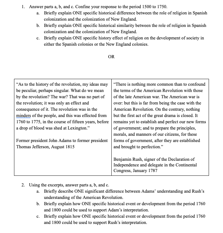 AP U.S. History: Semester 1 Final Exam: Short Answer Question - SY22