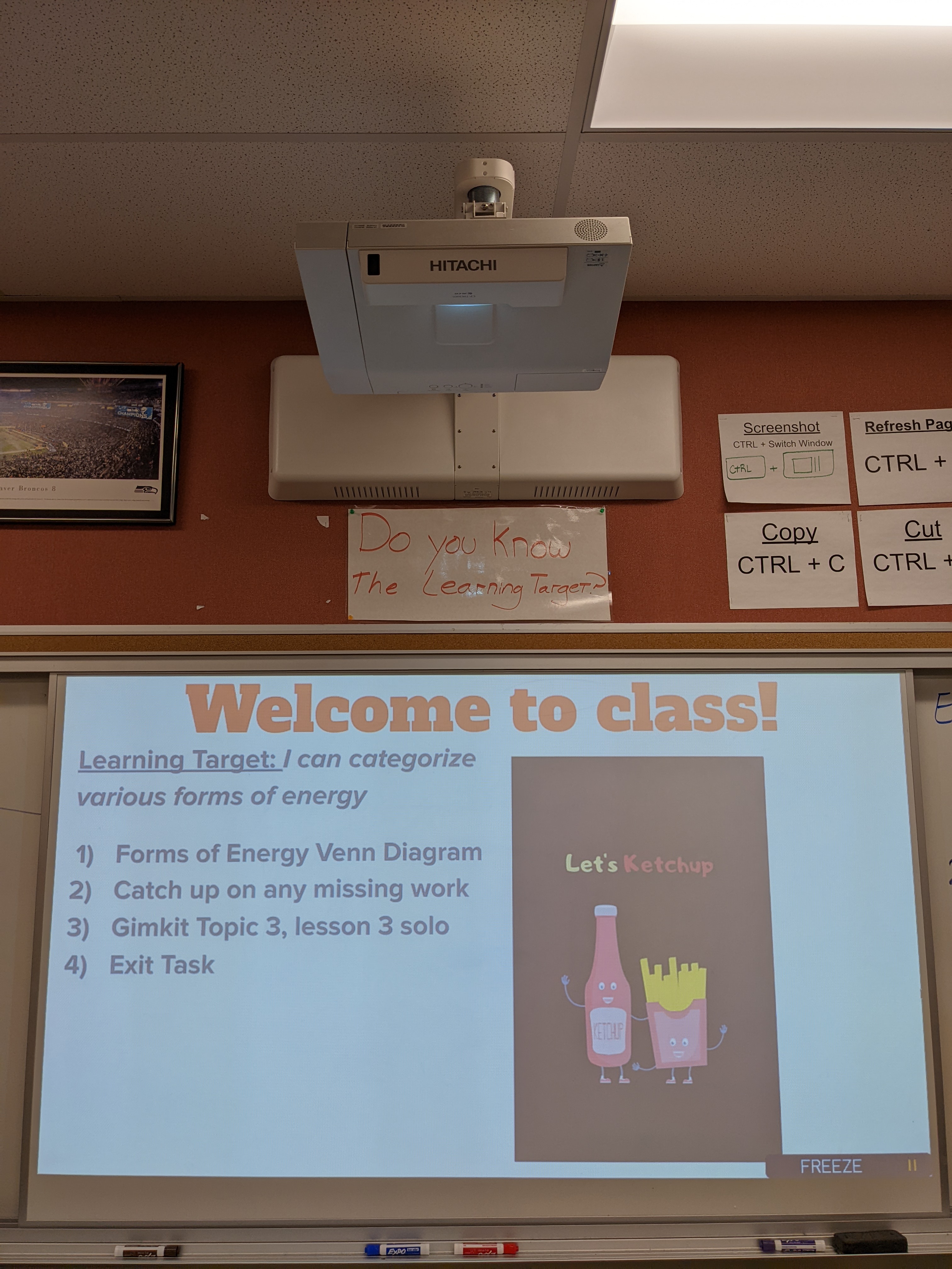 Describe at least two forms of energy you observe in this object (the projector, not the white board). Explain how you know it has that type of energy. (Ex. "This object has electromagnetic energy. I know it does because it is giving off visible light.")