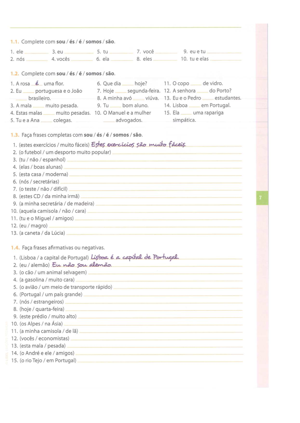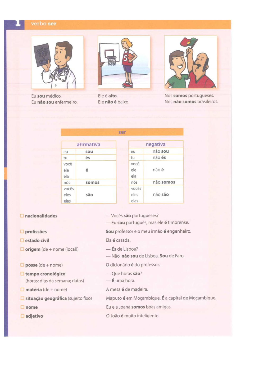 Tu és estudante de português. Ele é irlandês. Ela é solteira. Você é minha prima. Nós somos inteligentes. Vocês são amigos. Eles são irmãos. Elas são criativas.