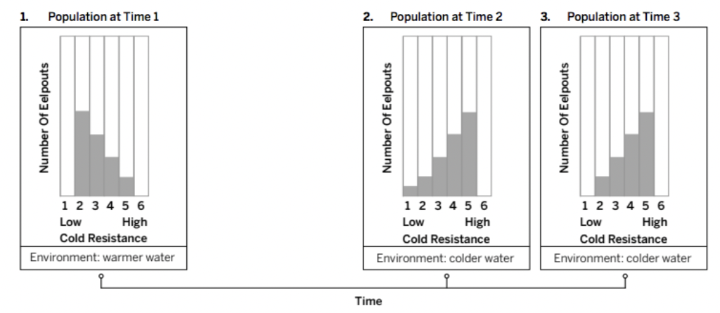 At Time 1, the Antarctic eelpout lived in warmer water. When land masses moved millions of years ago, the water became colder. Time 2 represents some time after the environment changed. Time 3 represents many generations after the environment changed. Review the histograms below.