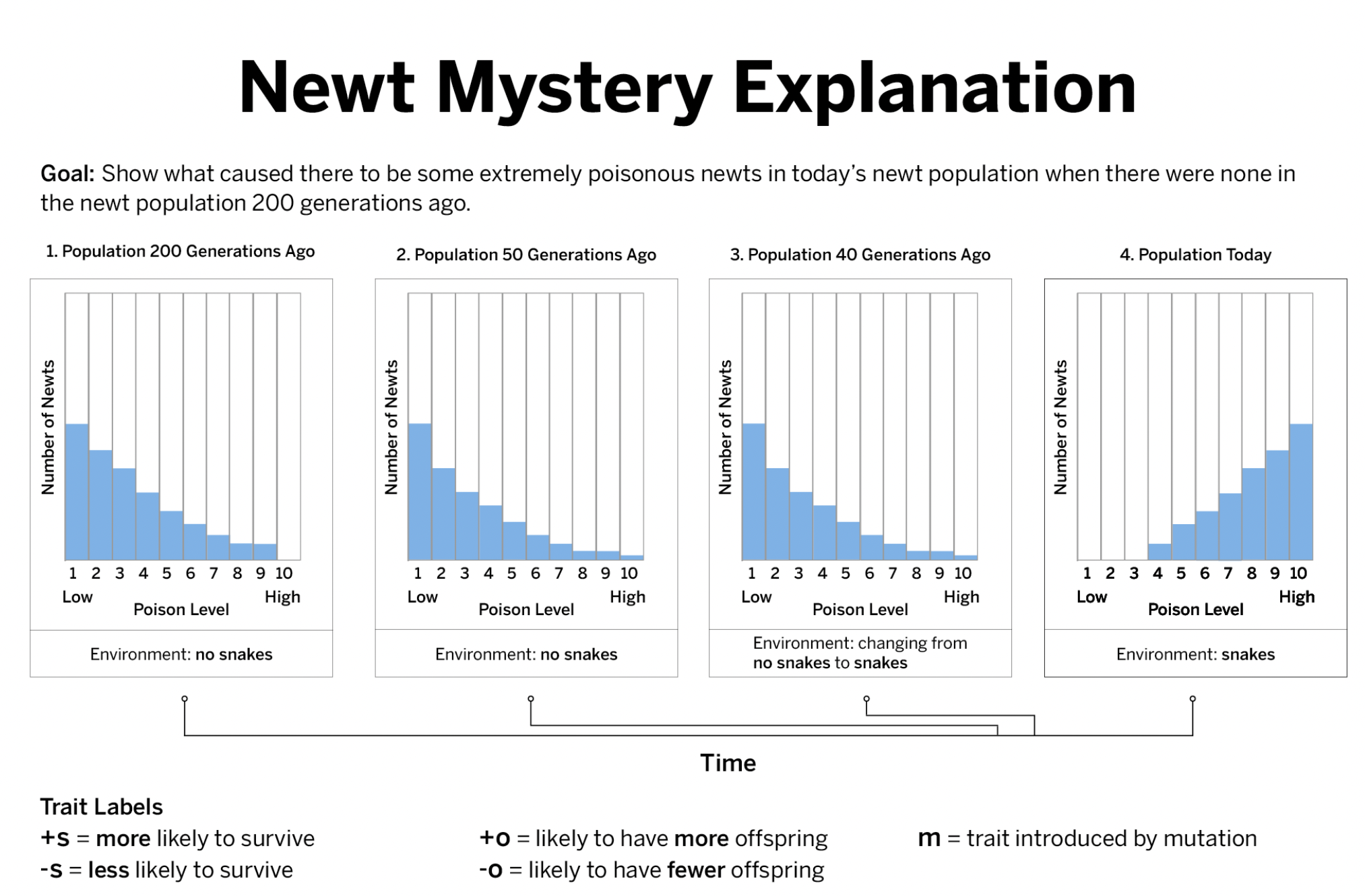 Explain how your model answers the question: How did a poison-level trait that wasn’t always present in the newt population become the most common trait?