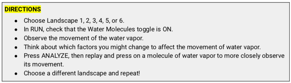 GOAL: Use the Sim to investigate how water vapor gets to different areas in the atmosphere. We’ll use landscapes in the Sim with similar bodies of water.