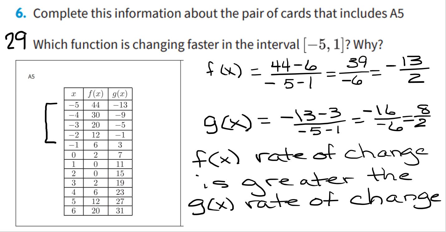 For card A5, which function is changing faster in the interval [-5, 1]? Why?
