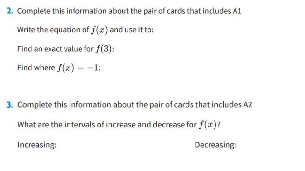 Vipindi vya nyongeza vya f(x) kwa kadi A2