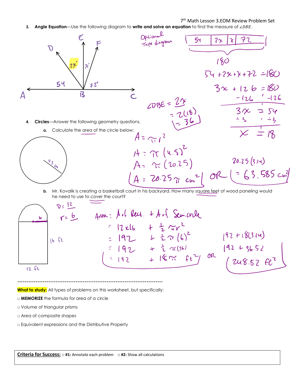 **Remember that you need to MEMORIZE the formula for the area of a circle. It will not be given to you on our assessment**