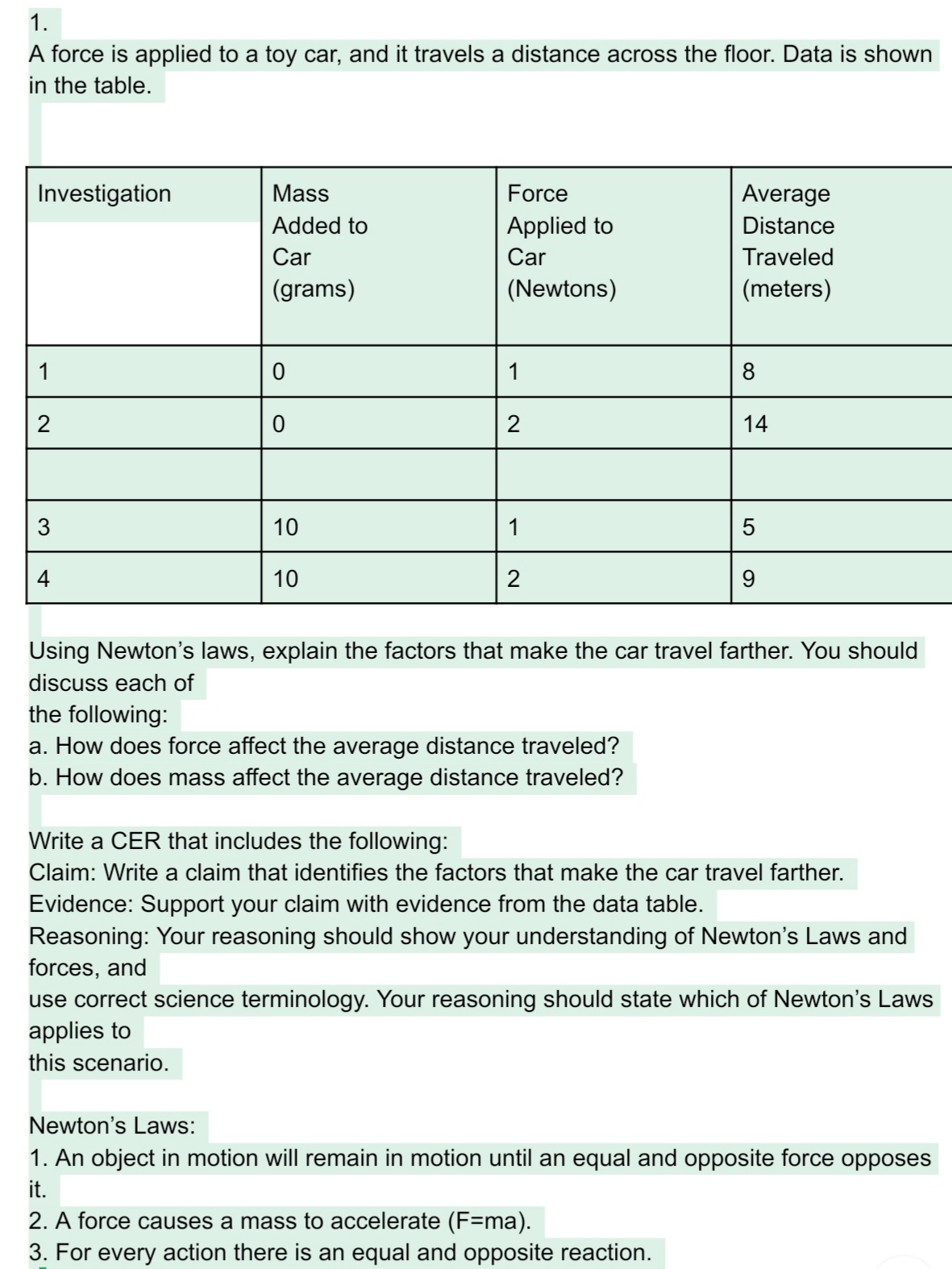 Provide 3 pieces of evidence based upon the data in the table (you might have to do some calculations. F=ma). You need to include the data in your response. Whatever you do, DO NOT SAY, "according to the graph," (Bc it's not even a graph) and do not say, the "the table says..." You MUST provide actual data.