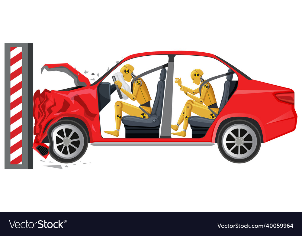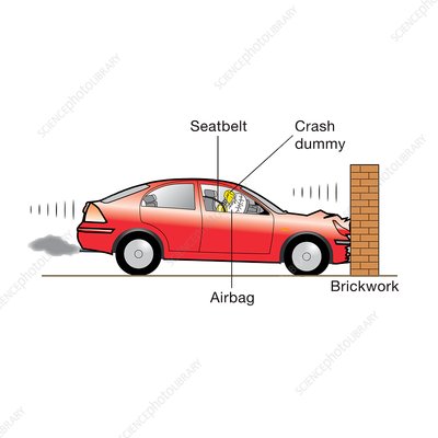 Imagine there was a car crash. (Refer to the image). Describe what happens to the person and how the airbag helps you from getting hurt (all according to Newton's Laws).