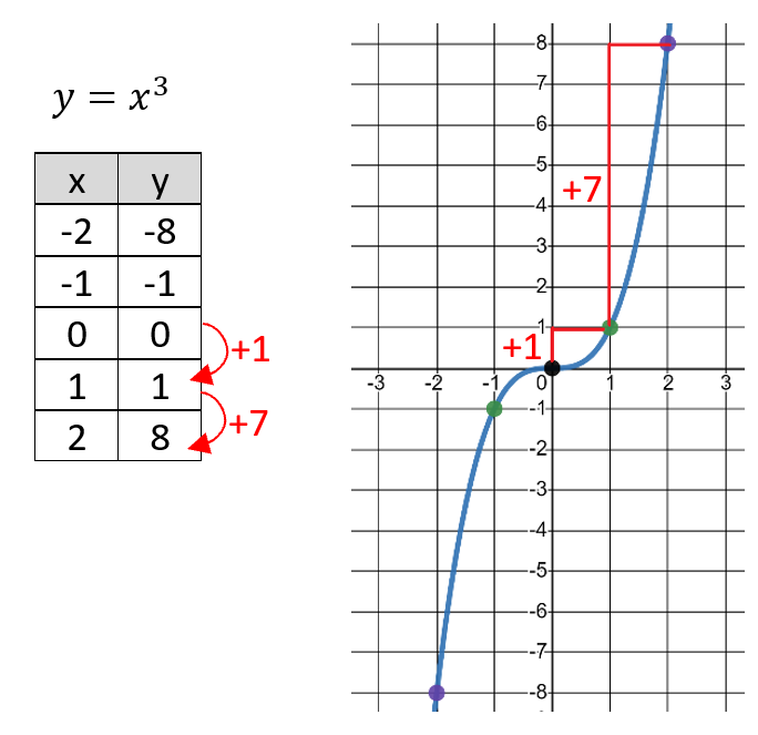 When graphing y=x^3 the change/difference in the __________ is "1,7".