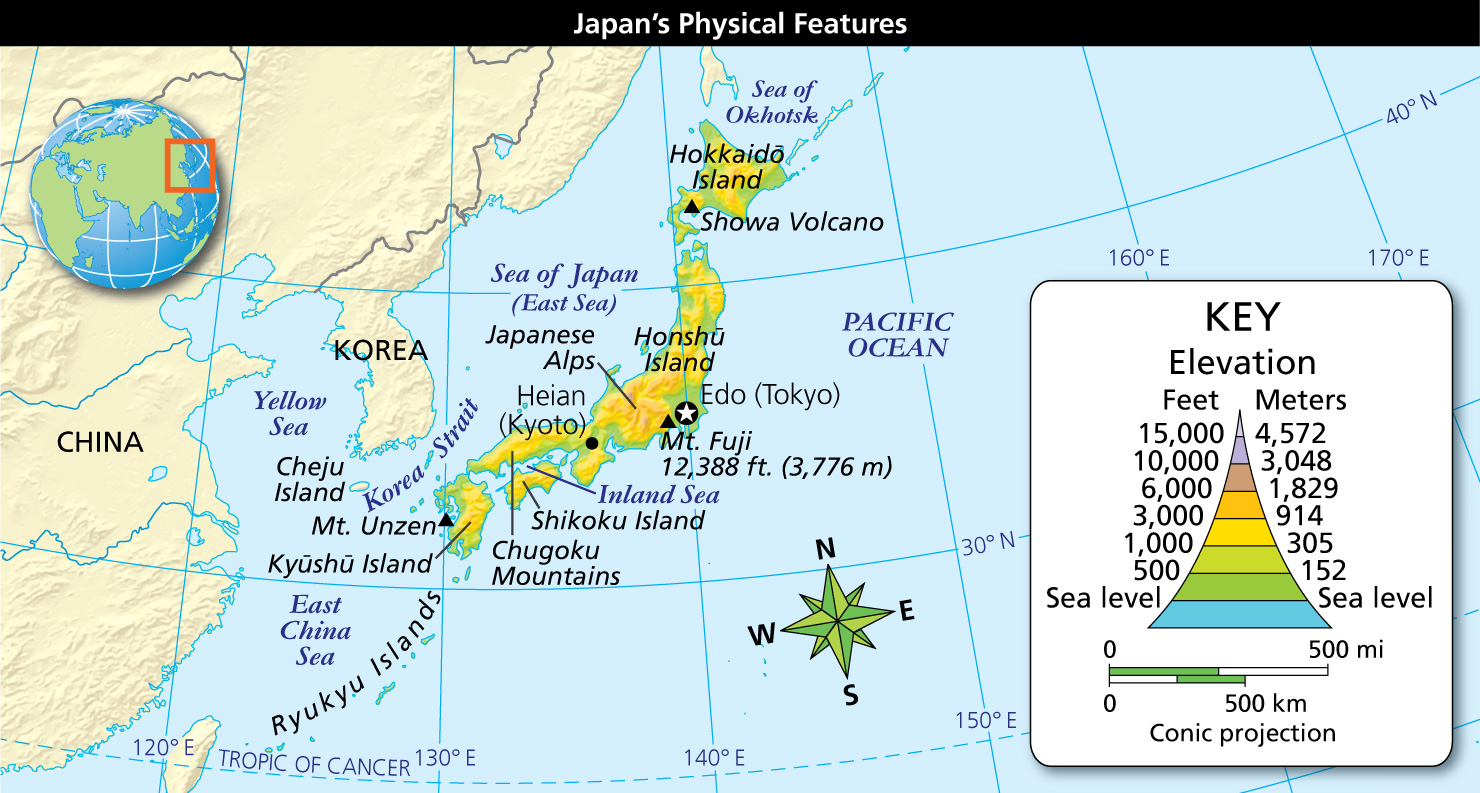 Japan is an archipelago, or chain of islands. To Japan’s west is the continent of Asia. To the east lies the broad Pacific Ocean.