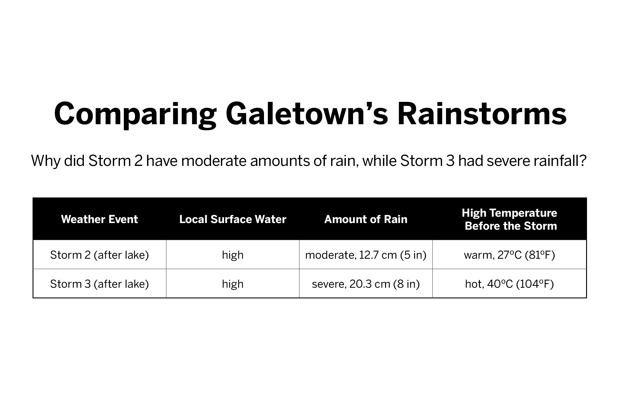 In order to explain and compare Storms 2 and 3 in Galetown, use your knowledge of Weather Patterns to create sentences that answer the question:Why is the amount of rain in Galetown different from storm to storm?
